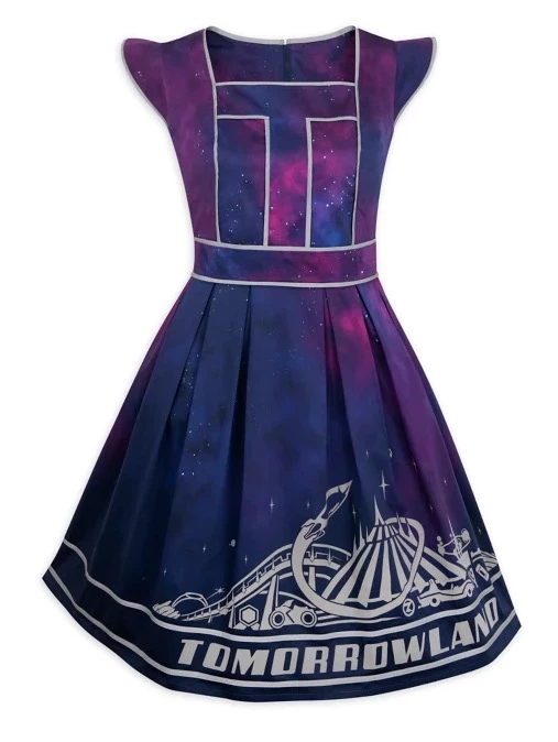 Step into a utopian world on-the-move in this retro-futurism dress themed to Tomorrowland at Walt Disney World’s Magic Kingdom. A constellation print, Tomorrowland icons, and silvery trims will challenge the future of fashion at every spaceport.