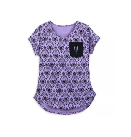 Experience a disquieting metamorphosis in this spirited tee decorated in the ghastly pallor of our Haunted Mansion wallpaper pattern. A chest pocket and v-neckline will draw you toward the light.